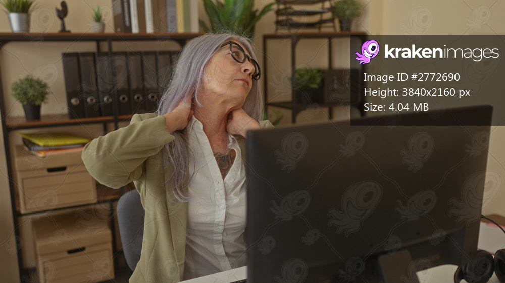 Woman stretching neck in office setting at computer desk indoors, showing signs of fatigue, with grey hair and glasses, suggesting workplace stress and need for relaxation. - Kraken Images