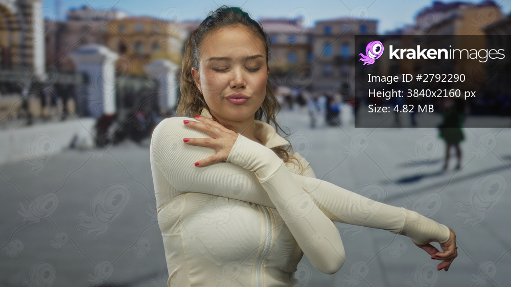 Woman stretching outdoors in plaza san pedro at the vatican with historic buildings blurred in the background capturing a serene moment.