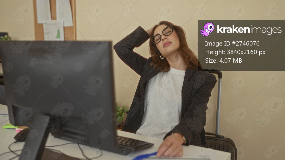 Woman stretching tiredly at her office desk with computer and suitcase visible, conveying a sense of fatigue and travel.