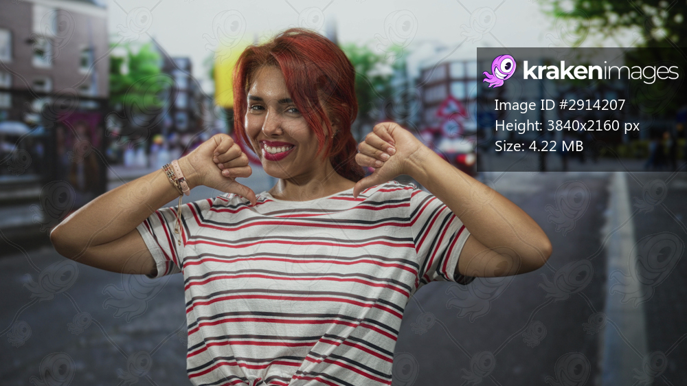 Woman with striped shirt, thumbs pointing to chest on street smiling broadly; confidence self belief.