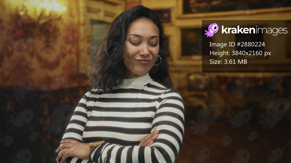 Woman with striped sweater crosses arms and smiles, showing watch and hoop earrings inside gallery building; friendly confidence.