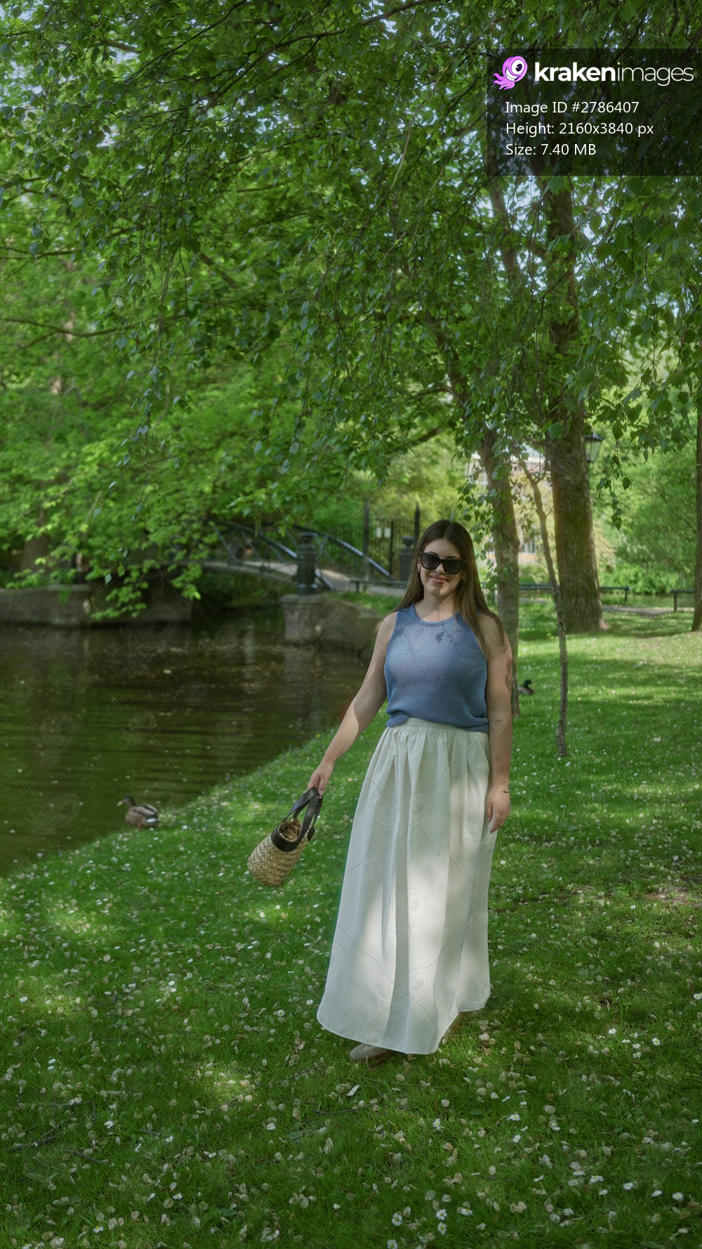 Woman strolling in sunny garden with green trees and small pond, wearing a blue top and white skirt, enjoying nature and tranquility outdoors with a woven basket. - Kraken Images