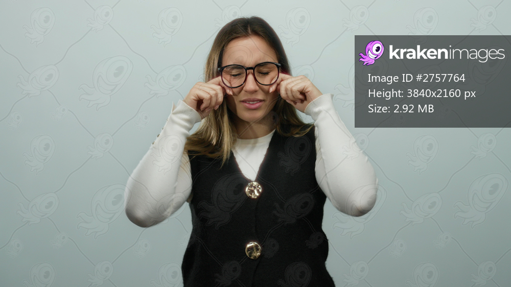Woman struggling with glasses on isolated white background appears frustrated adjusting eyewear in studio setting.