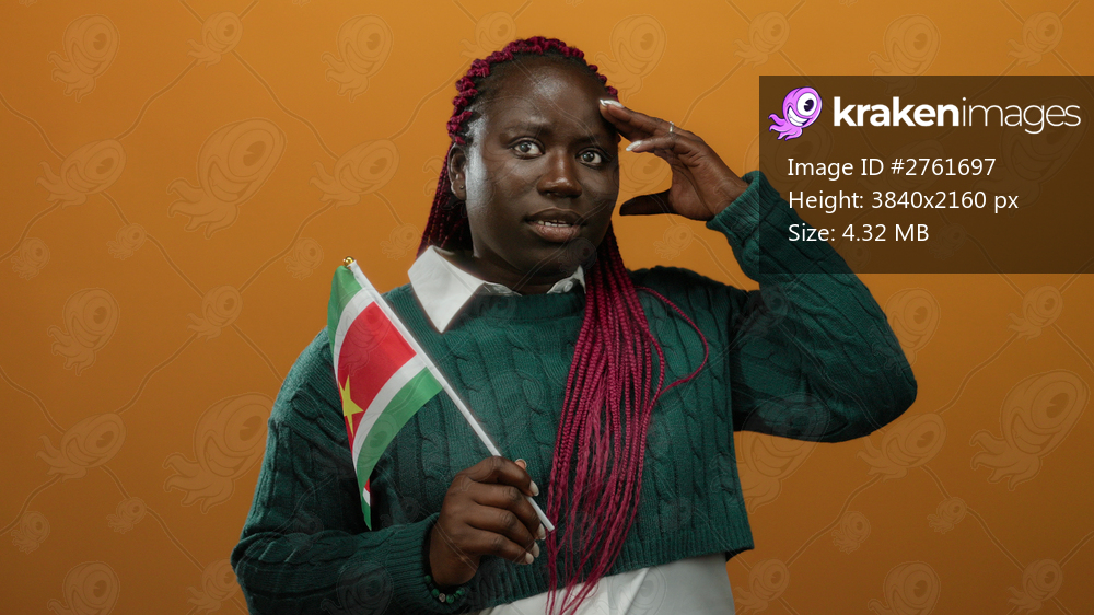Woman with suriname flag over orange background makes thoughtful gesture implying realization or idea while wearing a green sweater and pink braids.