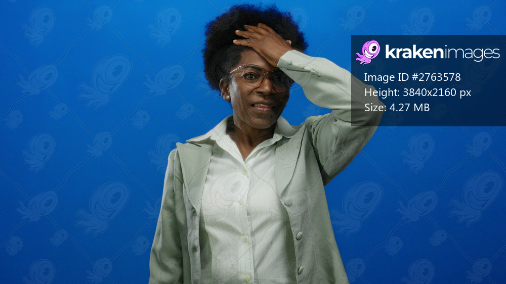 Woman surprised african american wearing glasses isolated on blue background with hands on head and expressing shock or disbelief in studio setting.