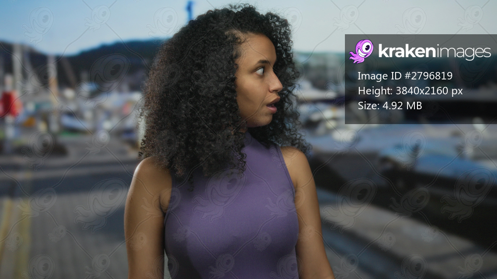 Woman with surprised expression at seaside port with boats and hills in background under clear sky.