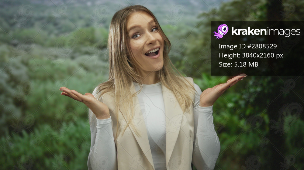 Woman surprised in a green park, displaying excitement with open arms, surrounded by lush vegetation, capturing a moment of joy and wonder.