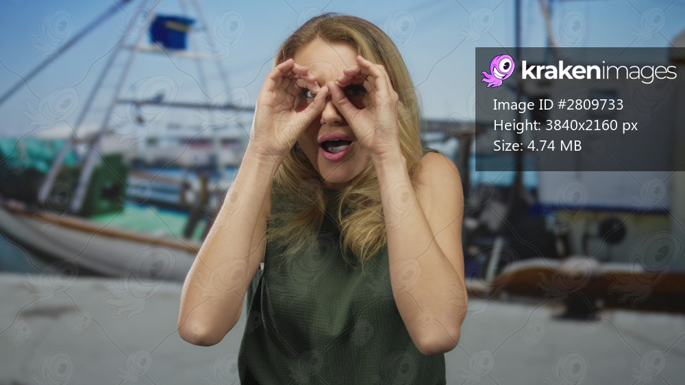 Woman surprised in port looking at sea with hands as binoculars, surrounded by boats and ocean scenery, capturing a fun outdoor moment.