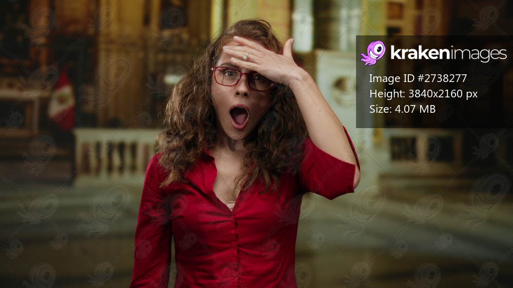 Woman surprised inside church with curly hair wearing glasses and red shirt with flag in background displaying shocked emotion indoors