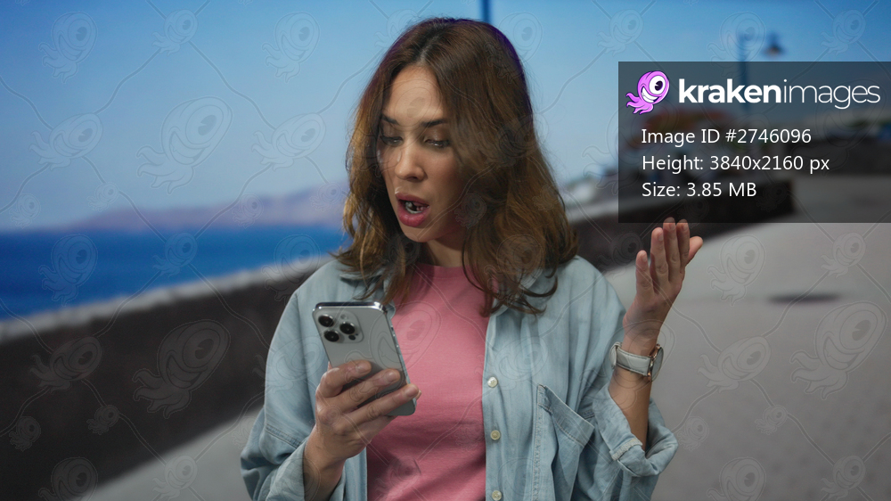 Woman surprised looking at smartphone on a sunny seaside promenade, with ocean in background, wearing casual jacket, expressing shock, outdoor setting, capturing a candid moment. - Kraken Images