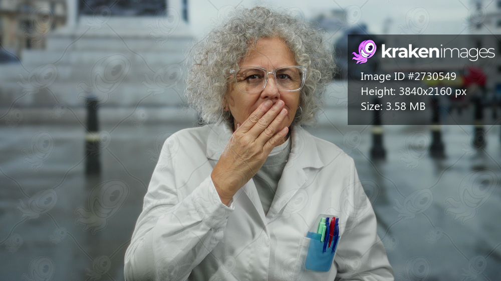 Woman surprised on an urban street wearing a white lab coat and glasses showcasing professional appearance in a city setting