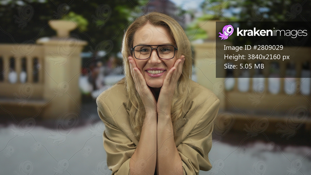Woman surprised on city street, blonde hair, glasses, smiling joyfully with hands on cheeks, captured outdoors against a sunny urban backdrop, conveying happiness and excitement. - Kraken Images