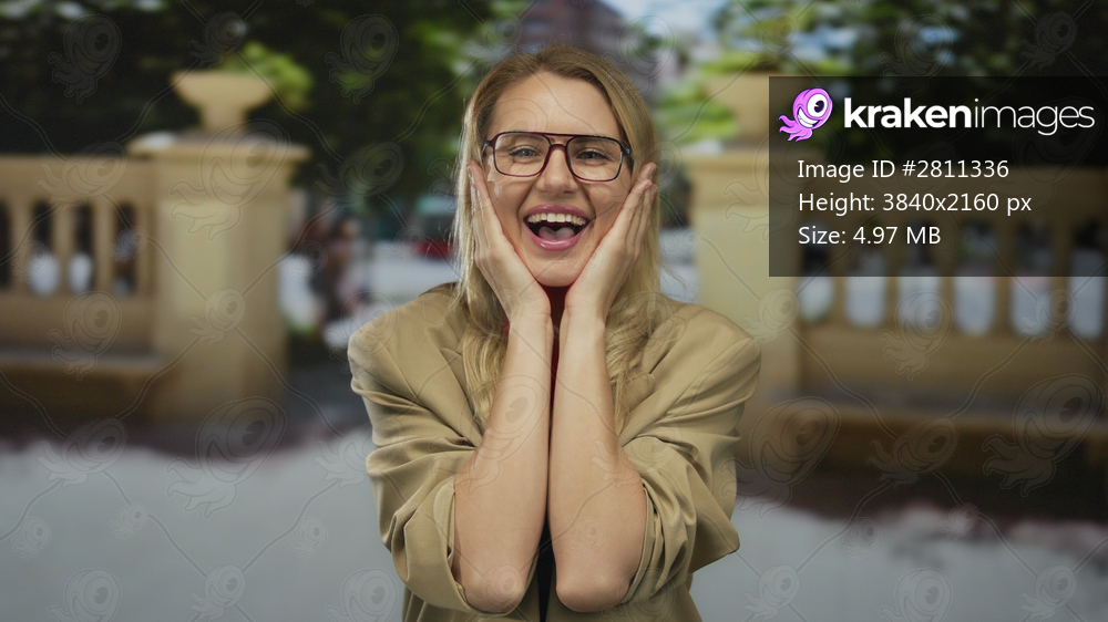 Woman surprised on city street, blonde hair, glasses, smiling joyfully with hands on cheeks, captured outdoors against a sunny urban backdrop, conveying happiness and excitement. - Kraken Images