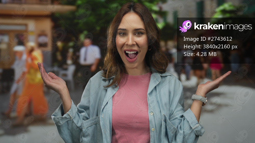 Woman surprised on city street wearing denim and pink, covering eyes with playful expression, surrounded by people outdoors, vibrant and lively urban scene, hispanic ethnicity. - Kraken Images
