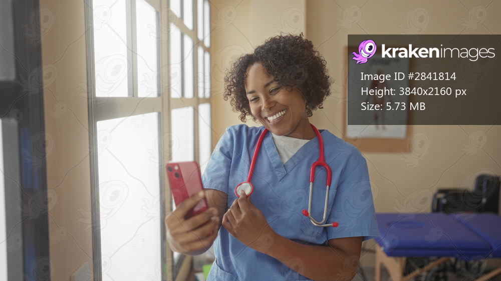 Woman takes selfie with smartphone wearing blue scrubs and adjusts her stethoscope near window in building; joy care empathy healing.