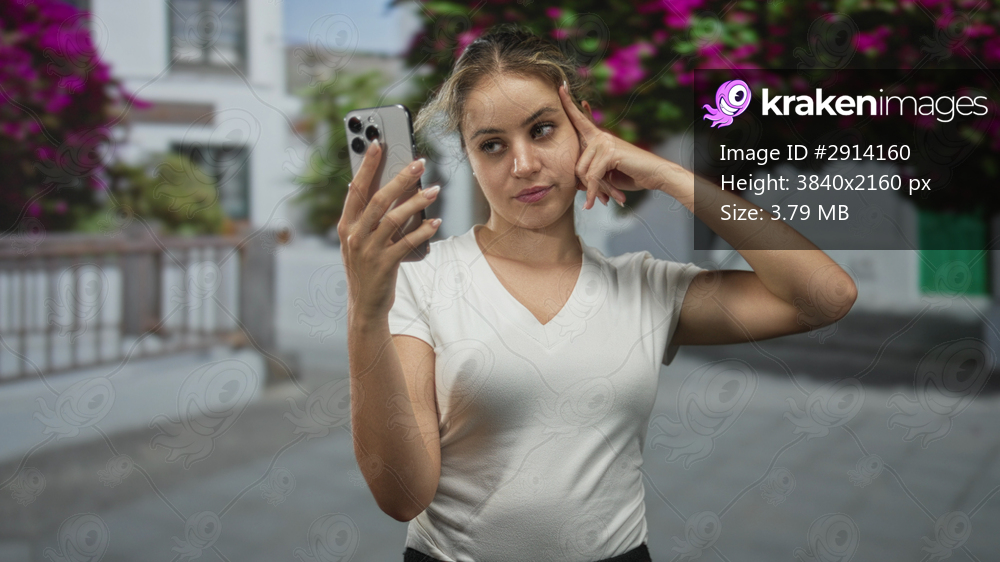Woman taking a selfie holding smartphone with finger to temple and hand on hip on a sunlit street near flowering building; skepticism distraction.