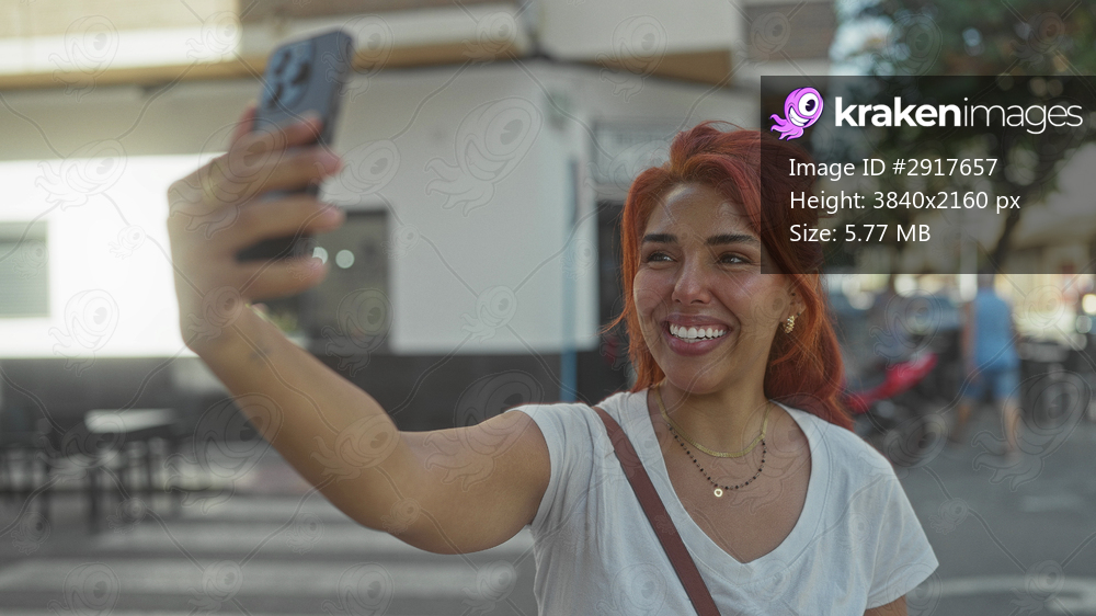 Woman taking a selfie with smartphone, arm extended on a city street crosswalk near cafe and parked scooter; joy confidence.