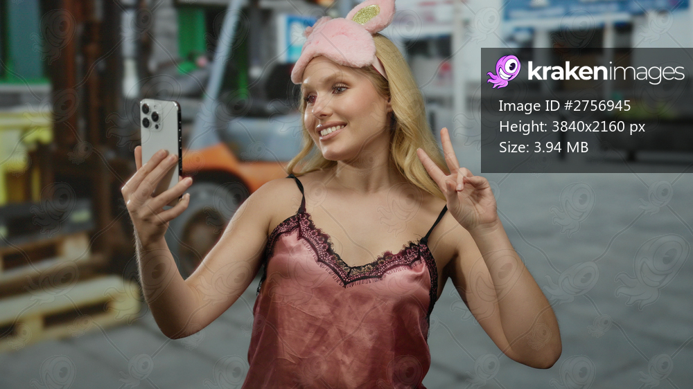 Woman taking selfie at construction site at night wearing pink nightwear with bunny ears headband and cellphone, making peace sign and posing playfully under industrial lights. - Kraken Images