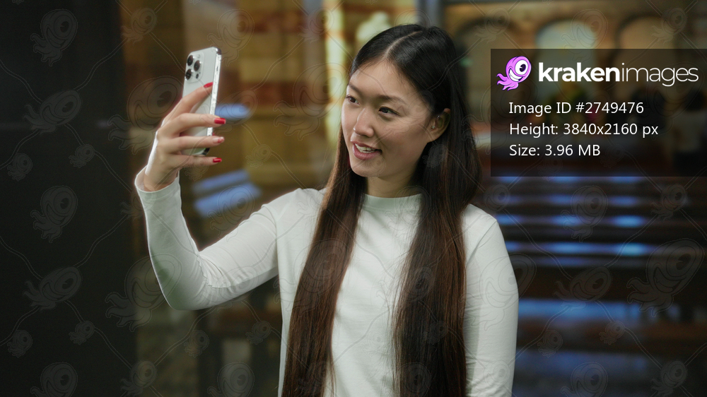 Woman taking selfie in a church setting with long hair, wearing white top, phone in hand, smiling broadly against blurred interior of religious building. - Kraken Images