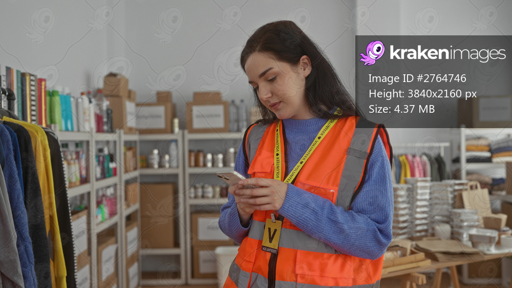 Woman taking selfie in a volunteer stand wearing orange vest surrounded by colorful clothes and boxes indoors.