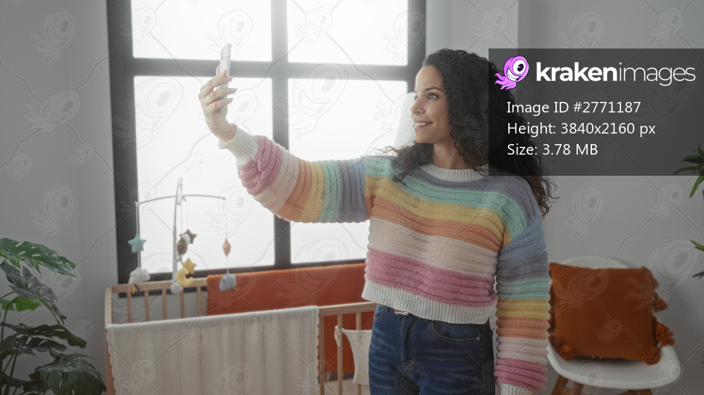 Woman taking selfie in cozy bedroom with crib mobile near window suggests a colorful, warm environment reflecting contemporary family life indoors.