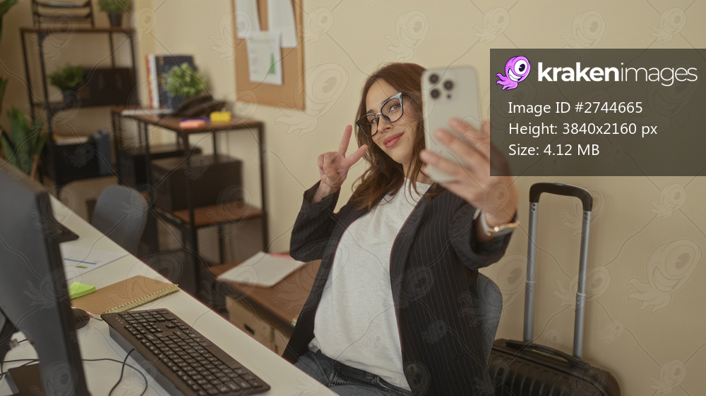 Woman taking selfie in office showing peace sign with smartphone in modern workplace wearing glasses and casual attire.