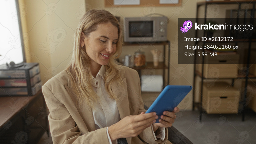 Woman taking selfie in office while sitting indoors wearing beige blazer with shelves and microwave in background showcasing casual workplace setting.