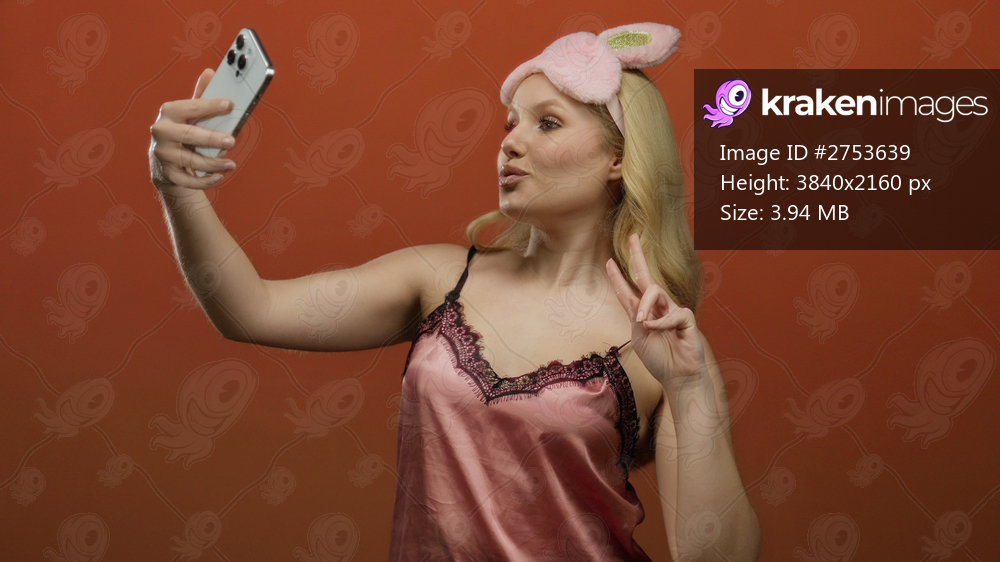 Woman taking selfie in pink nightwear with playful bunny eye mask against an orange background, exuding a casual, fun, relaxed vibe.