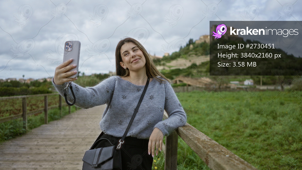 Woman taking selfie in scenic mallorca setting with historic castle in background on a wooden path showing vibrant greenery and overcast sky.