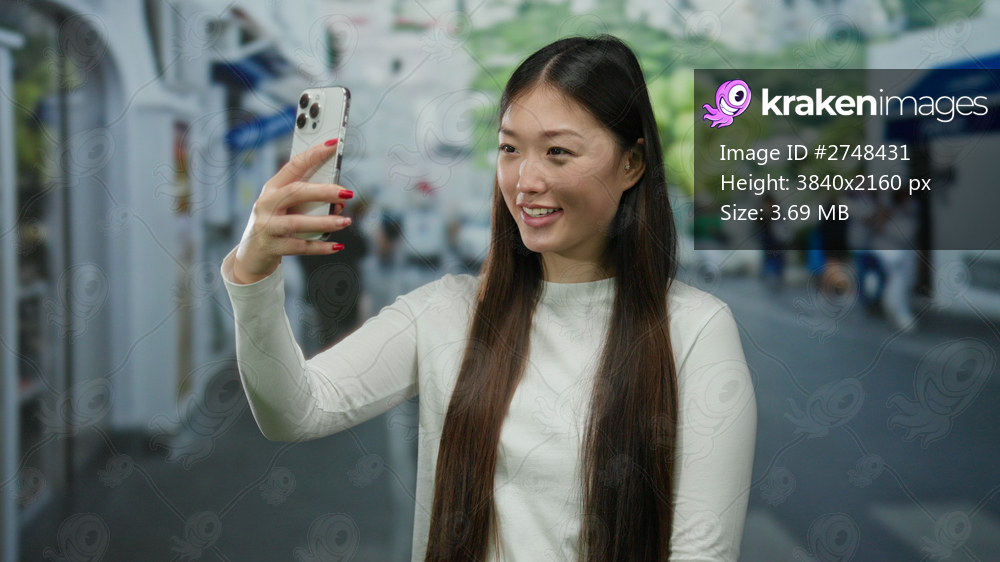 Woman taking selfie in urban street, smiling and holding smartphone with long hair and white shirt.