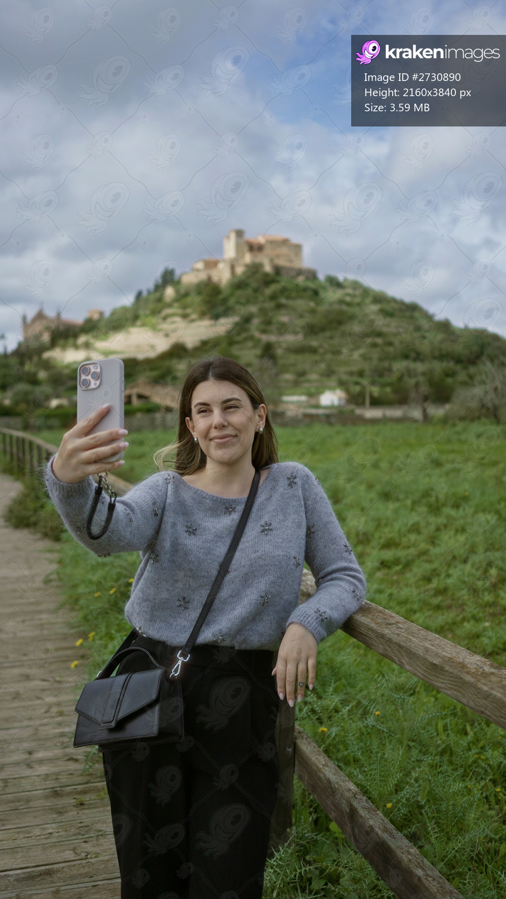 Woman taking selfie on a wooden path with a smartphone in a scenic old town of mallorca, capturing vibrant mediterranean backdrop, smiling in stylish attire. - Kraken Images