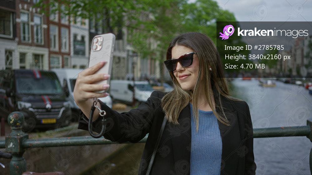Woman taking selfie on amsterdam canal bridge with smartphone showing urban canals and vibrant cityscape in the background.
