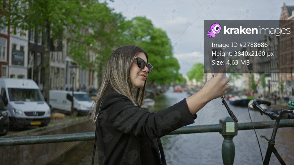 Woman taking selfie on amsterdam canal bridge with smartphone showing urban canals and vibrant cityscape in the background.