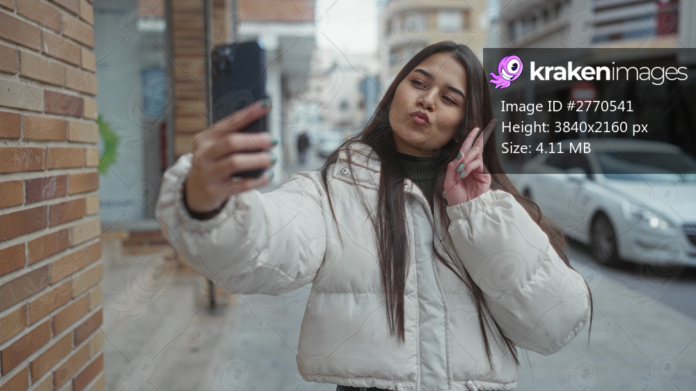 Woman taking selfie on street in winter coat with smile gestures and urban backdrop, capturing joyful moments in a city outdoor setting with buildings and cars visible. - Kraken Images