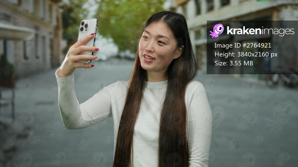 Woman taking selfie on urban street captures cheerful moment with long hair and white shirt reflecting modern lifestyle in busy city environment.