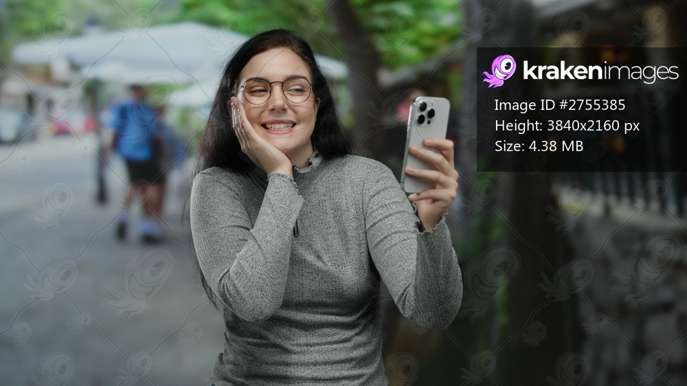 Woman taking selfie outdoors on street looking confident while adjusting hair wearing glasses and gray sweater with blurred urban background.