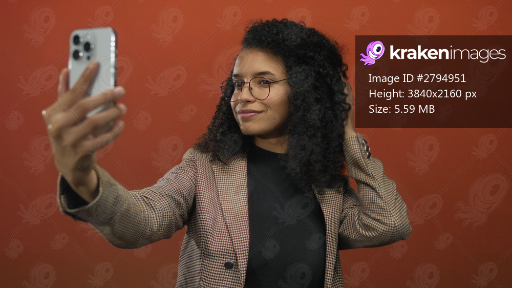Woman taking selfie with smartphone against red background wearing glasses and stylish blazer, showcasing modern fashion and confident expression in isolated studio setting - Kraken Images