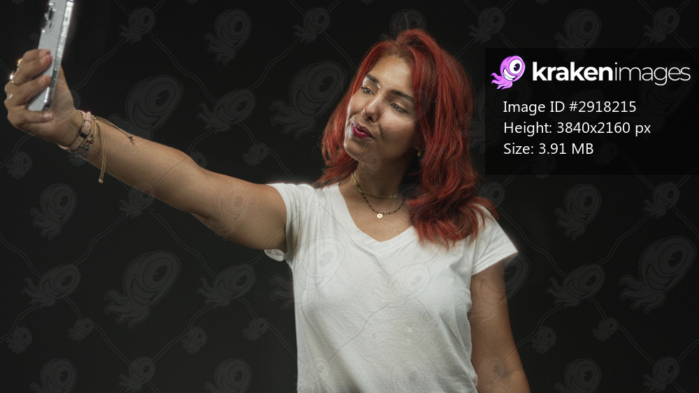 Woman taking selfie with smartphone and extended arm in black studio; confidence self expression candid.