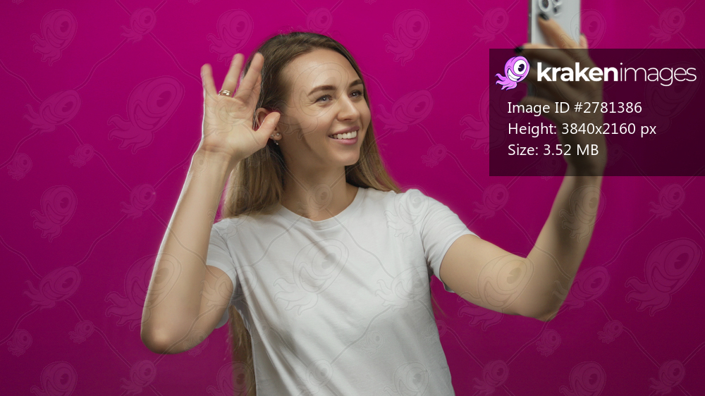 Woman taking selfie with smartphone smiling against pink wall making peace sign and capturing fun moment on camera for social media engagement