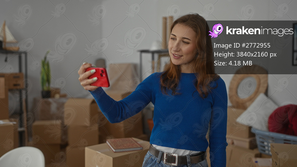 Woman taking video call in new home surrounded by moving boxes in living room with casual attire and phone.