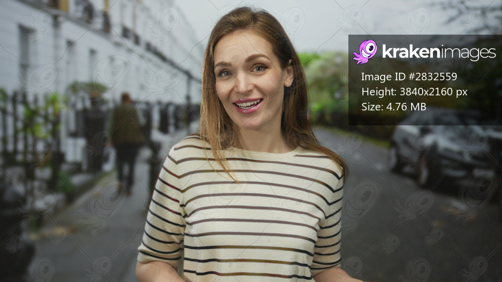 Woman talking with hand gestures on a city street by parked cars and white building under overcast sky; joy.