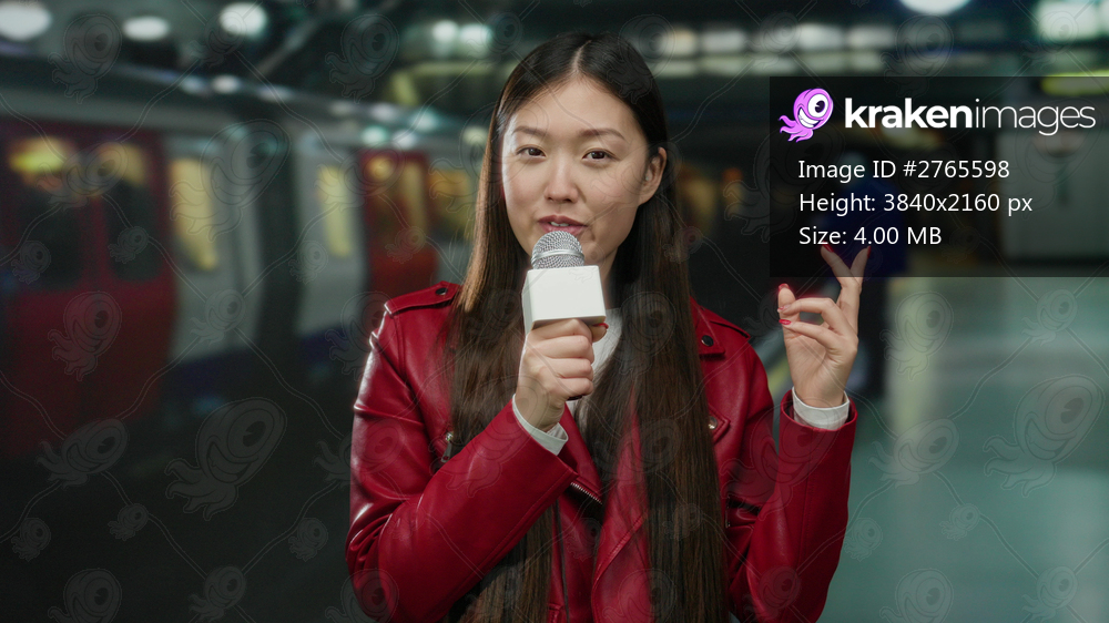 Woman talking into microphone at indoor train station in china wearing red jacket with blurred train in background.