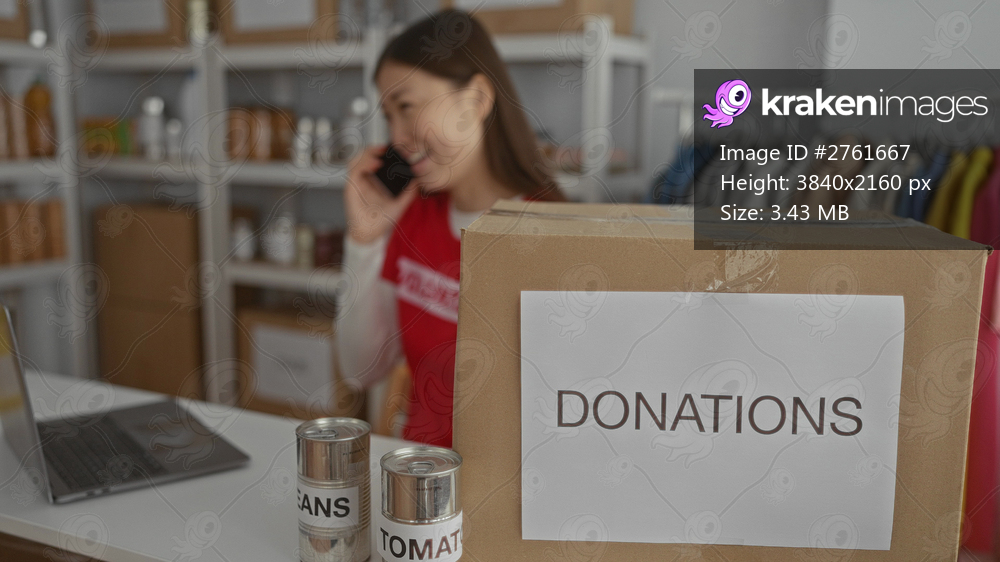 Woman talking on phone at charity center with donation box and canned goods on table indoors.