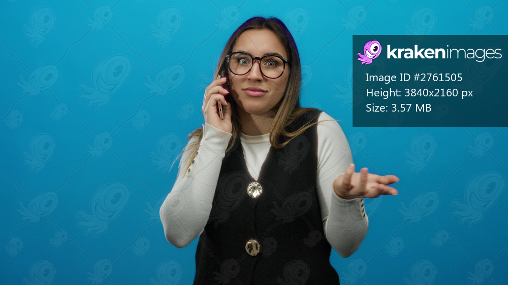 Woman talking on phone with confused expression against a solid blue background, wearing glasses and gesturing with free hand, conveying surprise and conversation intensity. - Kraken Images