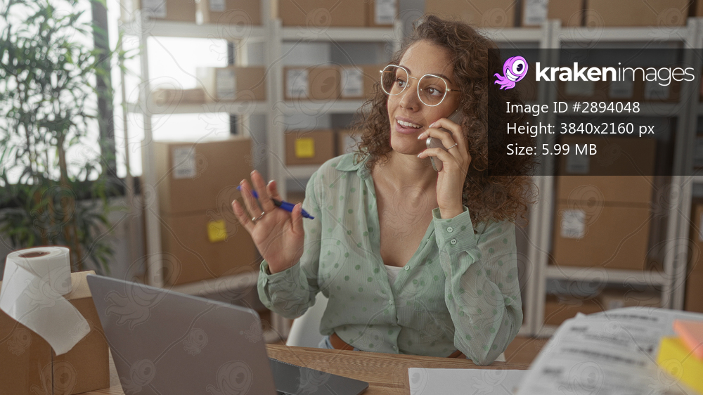 Woman talking on phone and gesturing with pen in a packed office building among parcel boxes; busy small business operations.