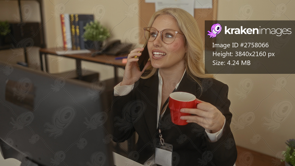 Woman talking on phone holding red mug in modern office with bookshelf in background, exuding professionalism and focus, blonde hair and glasses adding to confident appearance. - Kraken Images