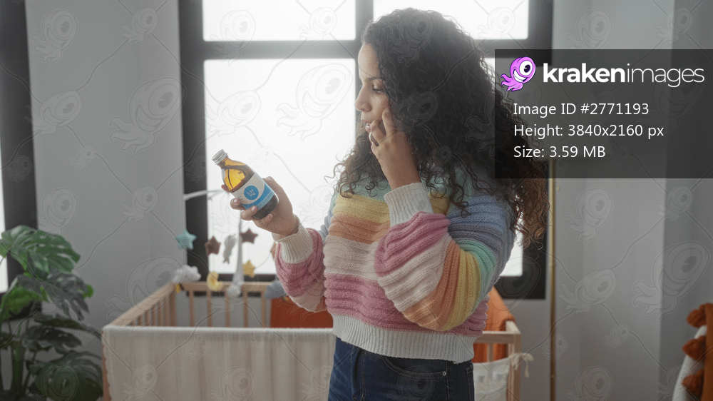 Woman talking on phone in a bedroom while holding medicine, standing near a crib in soft light, wearing a colorful sweater, creating a cozy and caring indoor atmosphere. - Kraken Images