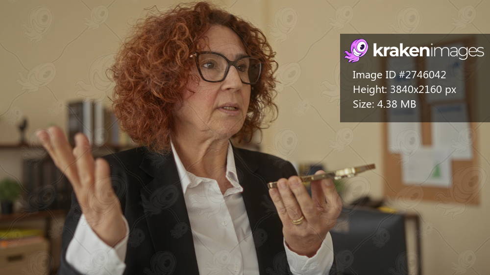 Woman talking on phone in a modern office with a focused expression, surrounded by books, plants, and charts on the wall, indicating a professional work environment. - Kraken Images