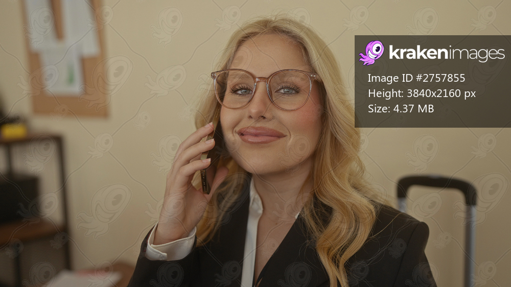 Woman talking on phone in a modern office, smiling blonde female wearing glasses, business attire, interacting indoors with a happy expression, highlighting confidence and communication. - Kraken Images
