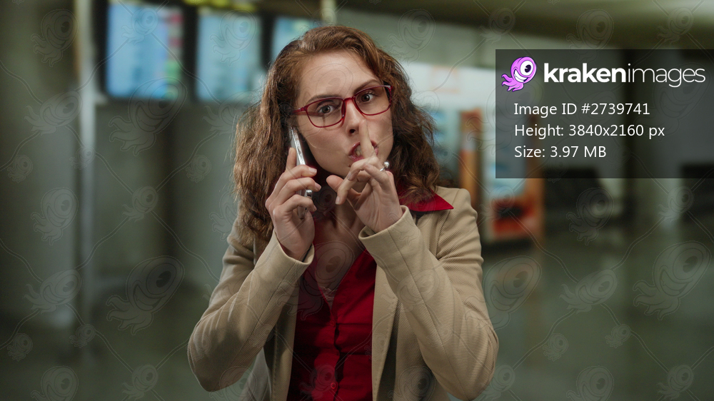 Woman talking on phone in airport terminal, wearing red glasses and beige blazer against blurred background of information screens and vending machine. - Kraken Images